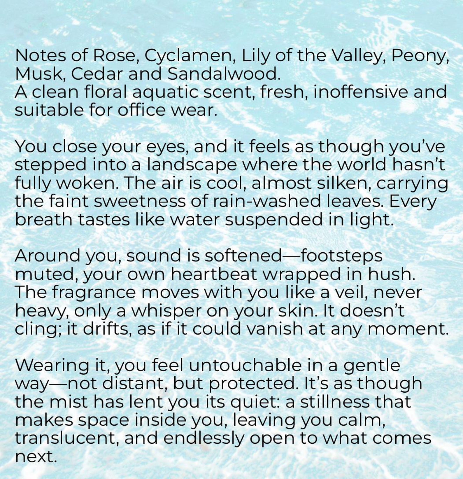 Mist is a handcrafted perfume inspired by the quiet power of the sea—where waves kiss the shore and salt lingers in the air. This coastal fragrance blends crisp seawater, soft musk, delicate lily of the valley, and juicy pear to create a scent that feels both clean and sensual.